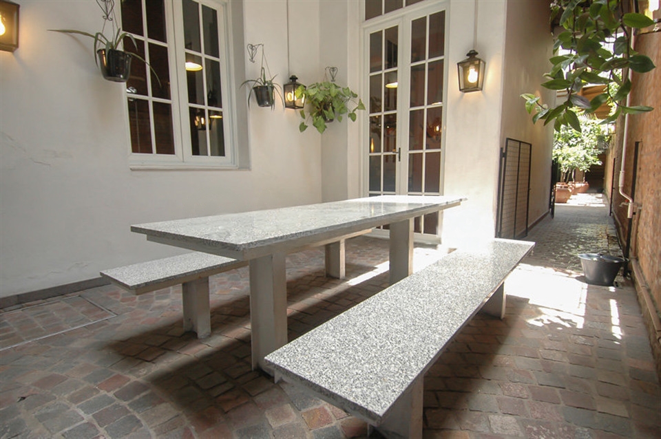 Un recorrido alternativo del inmueble nos lleva desde el pasillo de entrada a un amplio patio adoquinado, luego otro pasillo, y un segundo patio con mesa y bancos de mármol.